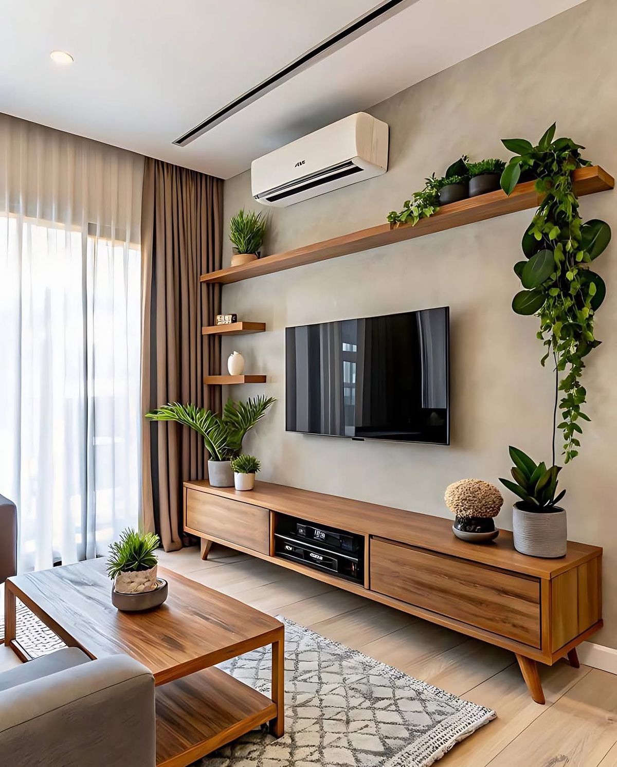 A integração de vasos em prateleiras altas e racks traz a natureza para dentro de casa, quebrando a rigidez dos eletrônicos e aquecendo o ambiente