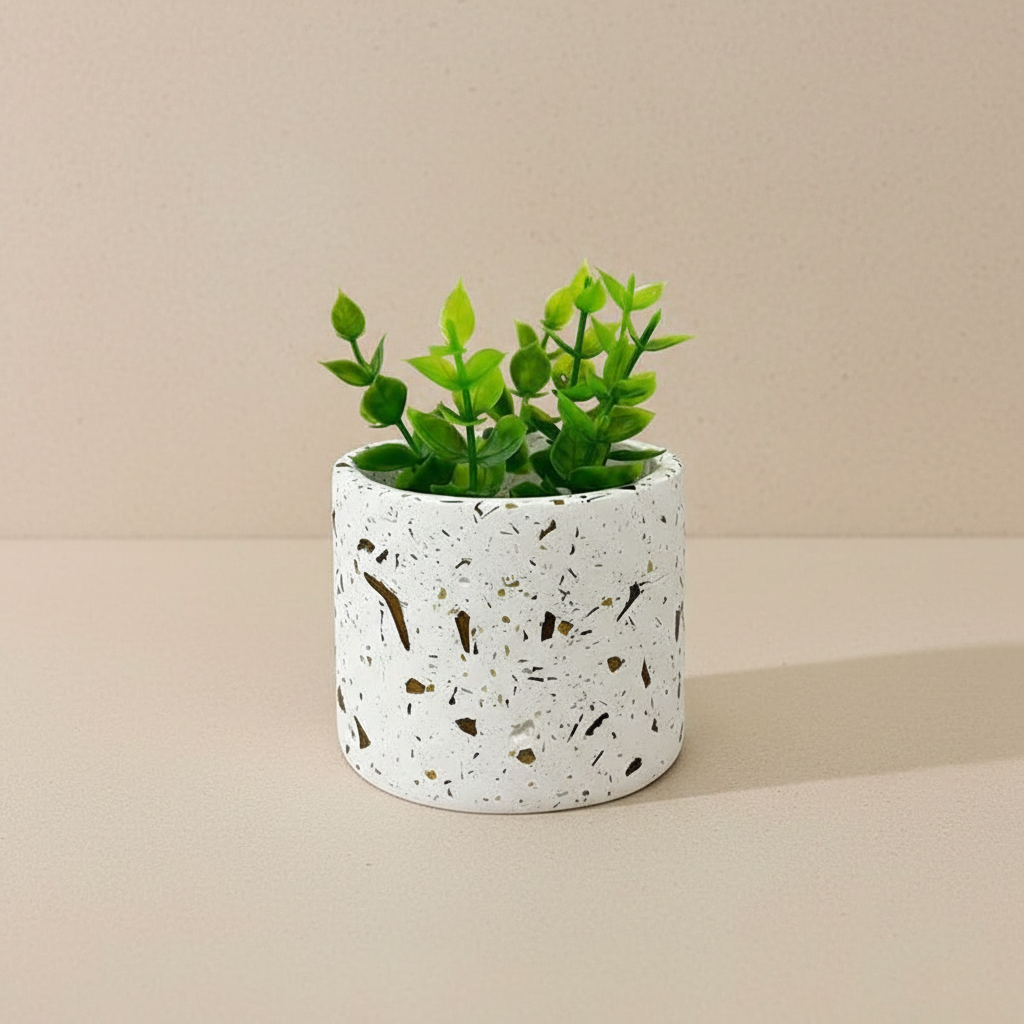 O Mini Cachepot Fragmento é uma ode ao detalhe. Parte da nossa Série Mineral, esta peça artesanal resgata a técnica do granilite, onde fragmentos minerais são imersos em uma base sólida para criar uma padronagem visual única e orgânica em cada exemplar.