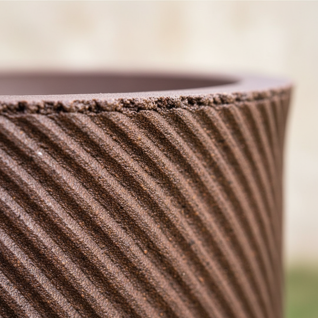 - Estética "Handmade": Sua textura em alto relevo, combinada com o tom marrom-acobreado, cria um jogo de luz e sombra idêntico aos cestos feitos à mão.
